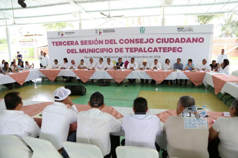 Tepalcatepec, Michoacán, a 2 de diciembre de 2016.- En seguimiento al compromiso de supervisar personalmente las obras y acciones que se llevarán a cabo en este municipio de Tierra Caliente para concretar su transformación, el Gobernador Constitucional del Estado, Silvano Aureoles Conejo, encabezó la tercera reunión del Consejo Ciudadano de Tepalcatepec.