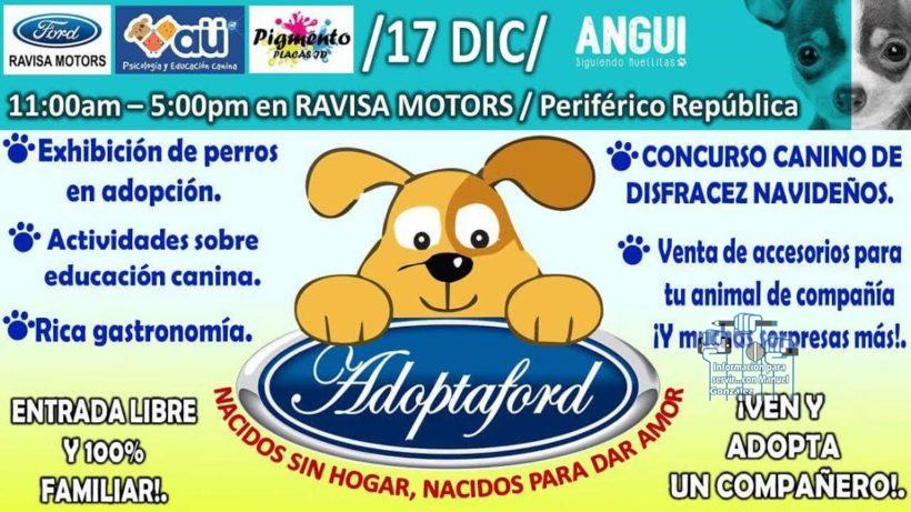 Con la finalidad de promover la cultura de la adopción, la esterilización y el rechazo a la compra venta de mascotas, este sábado 17 de diciembre, de las 11 a las 17 horas, en Ravisa Motors, se llevará a cabo una exhibición de perros en adopción.