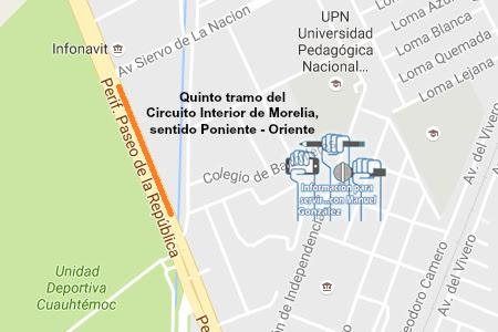 Morelia, Michoacán, a 3 de diciembre de 2016.- El Gobierno del Estado de Michoacán, a través de la Secretaría de Comunicaciones y Obras Públicas (SCOP), agradece la comprensión que la ciudadanía ha mostrado durante la construcción de la primera etapa del Circuito Interior de la capital michoacana, y da a conocer de nueva cuenta las vías alternas dispuestas ante el cierre a la circulación vehicular en cinco tramos del actual Periférico de la ciudad.