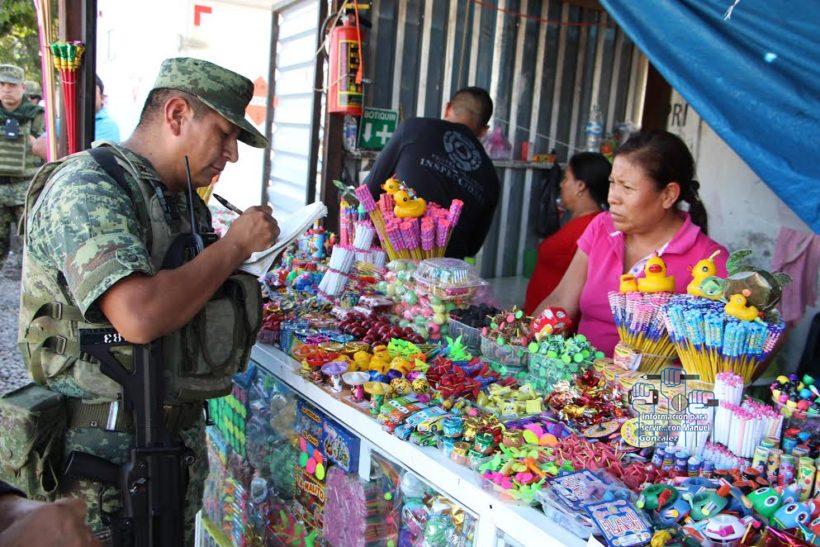 APATZINGÁN, MICH. A 22 DICIEMBRE DEL 2016.-Continuando con los operativos en beneficio de la población, la Secretaría de la Defensa Nacional en coordinación con la Policía Michoacán, Protección Civil e inspectores del Gobierno Municipal, efectuaron una revisión a los comercios con venta de artículos que contienen pólvora, que son muy empleados en esta temporada decembrina, con la finalidad de verificar que los vendedores cumplan con la normatividad y las instalaciones sean seguras.