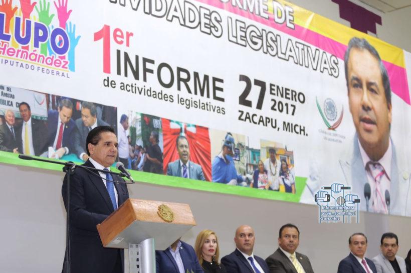 Zacapu, Michoacán, a 28 de enero de 2017.- El Gobernador del Michoacán, Silvano Aureoles Conejo, asistió como invitado de honor al primer informe de trabajo legislativo del diputado federal por el Distrito VII, José Guadalupe «Lupo» Hernández Alcalá.