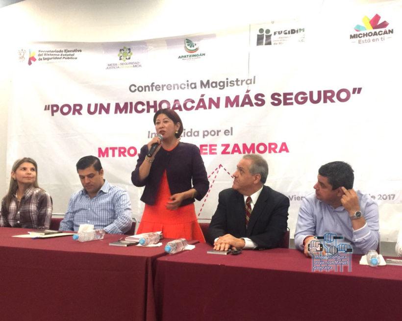 Morelia, Michoacán, a 28 de enero de 2017.- De la mano de la sociedad, el Gobierno de Estado, que encabeza Silvano Aureoles Conejo, trabaja para fortalecer la seguridad mediante una estrategia en la que la contención del delito y la prevención de la violencia y la delincuencia es fundamental, resaltó Ángeles Názares Jerónimo, titular del Secretariado Ejecutivo del Sistema Estatal de Seguridad Pública (SESESP) al presentar la conferencia “Por un Michoacán más seguro”, dictada el pasado viernes por David Lee Zamora.