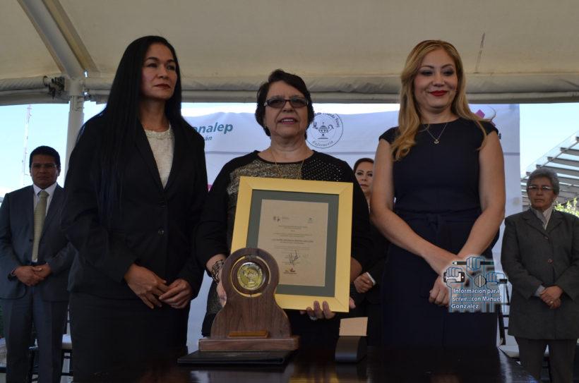 La directora general del subsistema, Minerva Bautista Gómez, entregó la Presea “Adela Velarde Pérez” a María Antonieta Benítez Arellano, con 22 años como maestra en la carrera técnica de Enfermería en el plantel Lázaro Cárdenas.