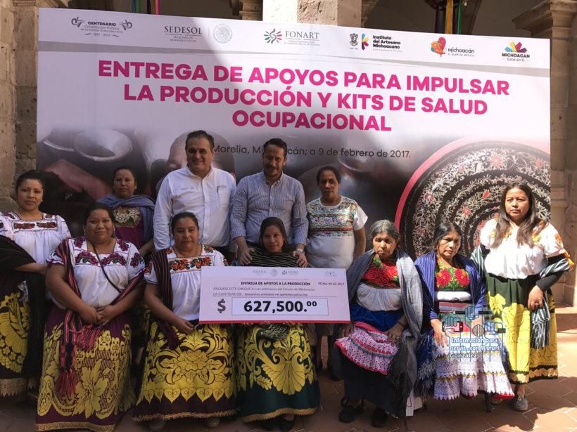 Durante la entrega de apoyos también estuvo presente la presidenta de la Unión Estatal de Artesanos Michoacanos, Emilia Reyes Oseguera, y la artesana beneficiaria de la localidad de San Jerónimo Purenchécuaro, Marisela Morales Carrillo.