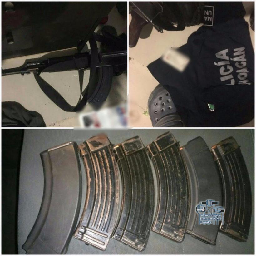 En la acción fueron localizados un fusil calibre 7.62, así como seis cargadores y diversos cartuchos, además de playeras con emblemas similares al de la Policía Michoacán y de la extinta Fuerza Rural.