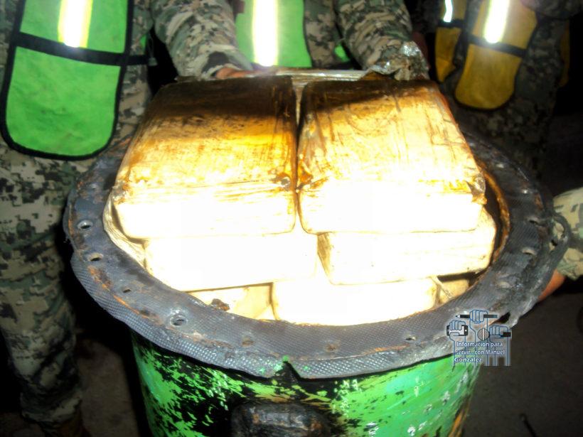 Los cilindros de 1.75 metros de largo por 50 centímetros de diámetro, estaban sumergidos y sujetos al exterior del casco en la parte delantera del buque; dentro de estos fueron localizados los paquetes con un peso promedio de un kilogramo cada uno.