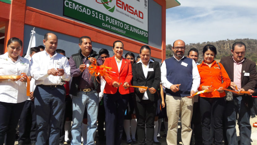 Puerto de Jungapeo, mpio. de Jungapeo, Michoacán, a 01  de diciembre de 2017.– Este jueves, la directora general del Colegio de Estudios Científicos y Tecnológicos del Estado de Michoacán (CECyTEM), Carmen Escobedo Pérez, inauguró en el Centro de Educación a Distancia (CEMSaD) de esta localidad, obras de infraestructura por el orden de los 2 millones 450 mil pesos, las cuales consistieron en la construcción de un área administrativa, tres aulas, un módulo de escaleras y otro de sanitarios.