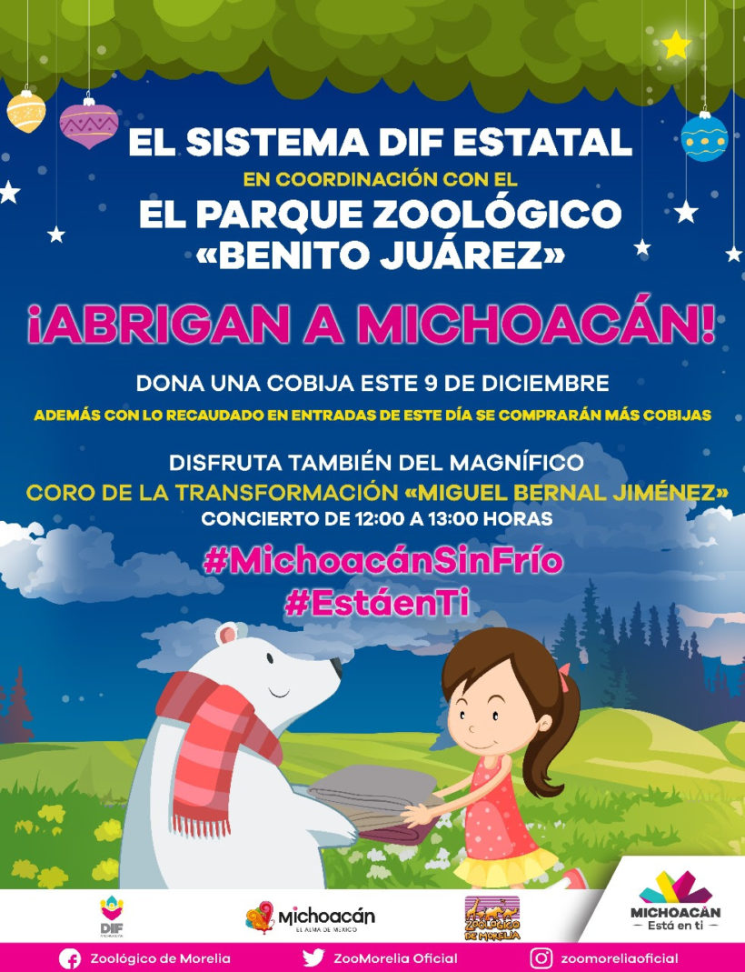 Quien desee donar cobijas y ropa invernal en buen estado, podrá llevarla a las instalaciones del Parque Zoológico, donde será recibida por personal del Sistema DIF Michoacán.