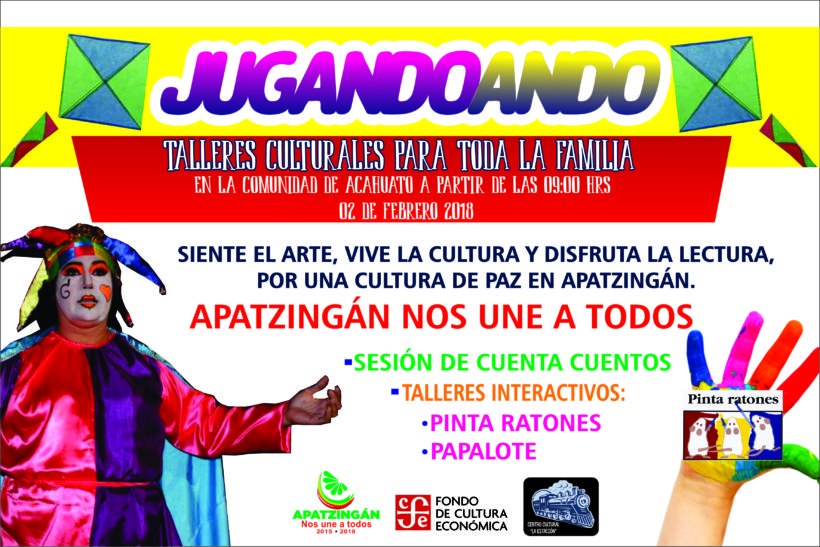APATZINGÁN, MICH.- Como parte de las festividades religiosas de la Virgen de la Candelaria, el Centro Cultural La Estación, llevará a cabo talleres itinerantes “Jugandoando” que incluye cuenta cuentos, pinta ratones y elaboración de papalote, dirigido a personas de todas las edades, en la tenencia de Santiago Acahuato.
