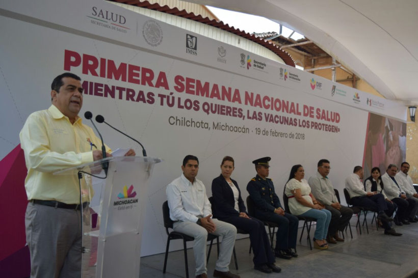 Chilchota, Michoacán, a 20 de febrero de 2018.- Con la representación del Gobernador Silvano Aureoles Conejo, este lunes el titular de la Secretaría de Salud de Michoacán (SSM), Elías Ibarra Torres, puso en marcha la Primera Semana Nacional de Salud 2018, con el lema «Mientras tú los quieres, las vacunas los protegen”.