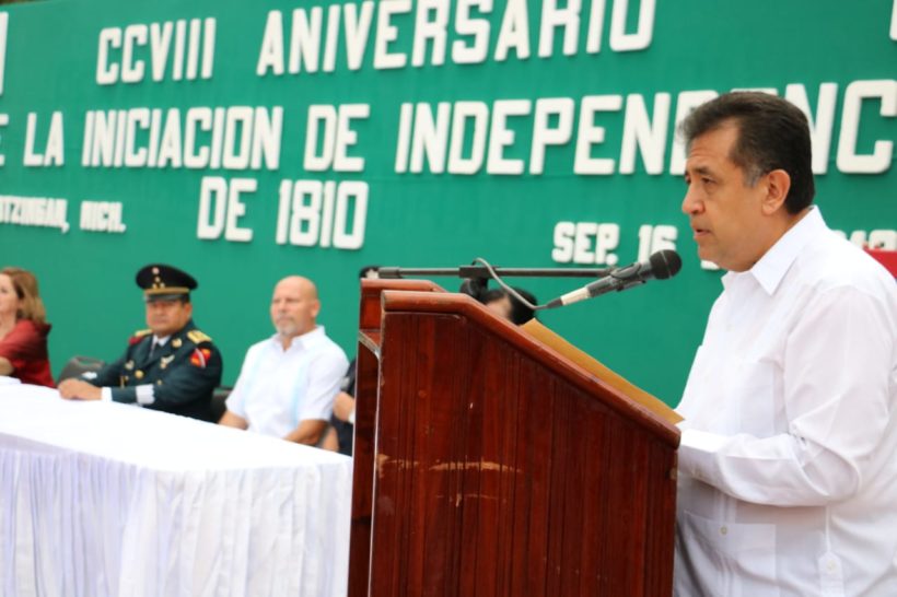 APATZINGAN, MICH., 16 DE SEPTIEMBRE DEL 2018.- Al presidir junto con autoridades civiles, educativas y militares el acto cívico con motivo del CCVIII Aniversario del Inicio del Movimiento de Independencia, el Alcalde José Luis Cruz Lucatero Orador Oficial del evento, afirmo, que el México libertario de 1810 y el México que se transforma en el 2018, son dos épocas hermanadas por el común denominador del anhelo de justicia social y desarrollo económico.