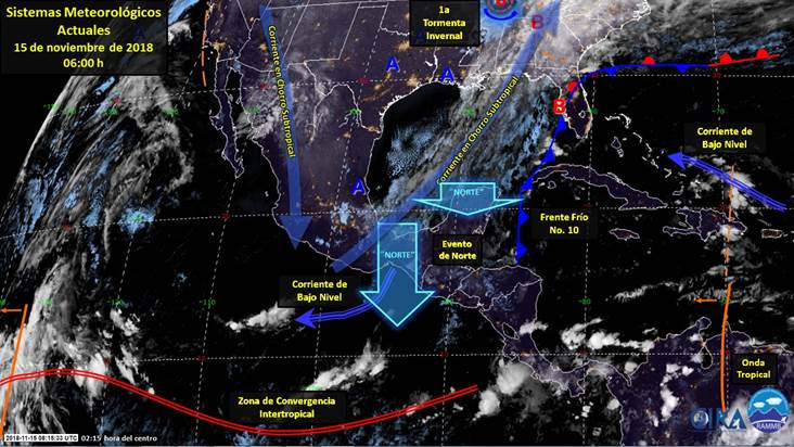 Para hoy, la primera tormenta invernal y el frente No. 10 dejarán de afectar al país. La masa de aire frío asociada al frente mantendrá ambiente gélido en gran parte del territorio nacional, con heladas en valles y zonas de montaña de algunos estados del norte y centro de México, así como evento de “Norte” en el sur del litoral del Golfo de México, Península de Yucatán, Istmo y Golfo de Tehuantepec. La corriente en chorro cruzará desde Oaxaca y Chiapas hasta el sur del Golfo de México y occidente de la Península de Yucatán, favoreciendo fuerte arrastre de humedad a lo largo de su trayectoria. Los sistemas meteorológicos mencionados ocasionarán los siguientes potenciales de lluvia