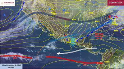 Golfo de México: Cielo nublado la mayor parte del día con tormentas puntuales muy fuertes en Veracruz y Tabasco. Ambiente fresco durante el día. Bancos de niebla en zonas montañosas y evento de «norte» con rachas de viento superiores a 60 km/h en costas de Veracruz y Tabasco.