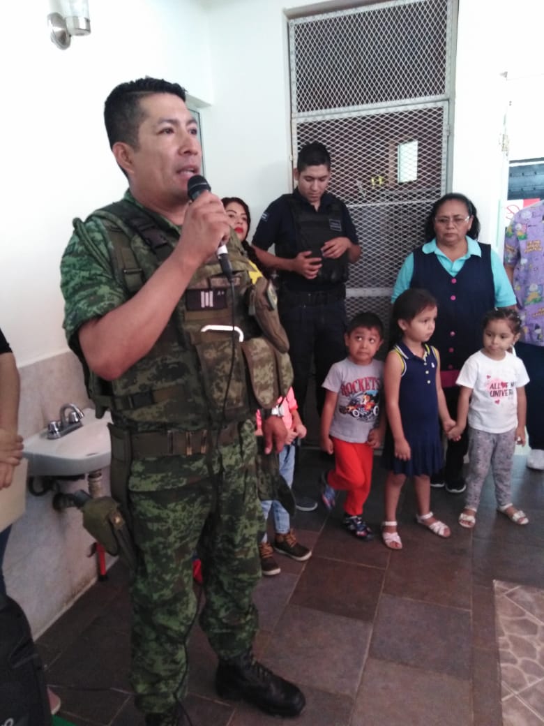 Con la presencia de la directora del DIF Municipal, Marivel López Alvarado y la titular de la Estancia Infantil, Martha Valencia, así como el personal docente y administrativo, se mantuvieron atentos a las indicaciones que explicaron los elementos de la Sedena y Protección Civil.