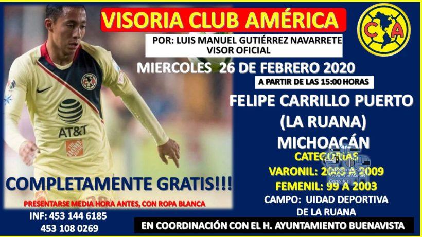 BUENVISTA, MICH., 12 DE FEBRERO DE 2020.- El Gobierno Municipal de Buenavista a través de la dirección de educación y juventud, invitan a todos jóvenes nacidos entre 2003 y 2009 y mujeres nacidos entre 1999 y 2003 que gusten del futbol a que este 26 de febrero asistan a las visorias que se realizaran en el campo de la Unidad Deportiva de la Tenencia de Felipe Carrillo Puerto, la Ruana, ello por parte del visor oficial del Club América Luis Manuel Gutiérrez Navarrete.