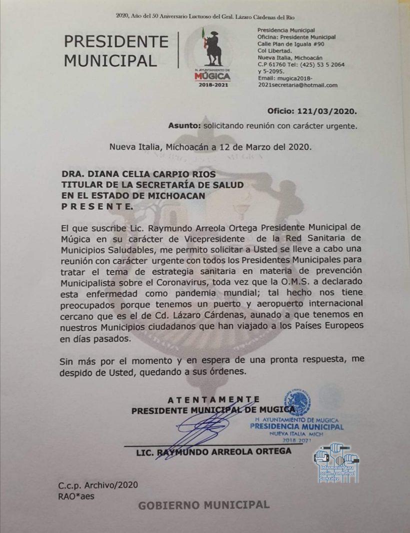 NUEVA ITALIA, MPIO. DE MUGICA, MICH., 12 DE MARZO DE 2020.- El Gobierno Municipal de Múgica que preside el Alcalde Raymundo Arreola Ortega, ha emitido a la Secretaria de Salud de Michoacán, Diana Celia Carpio Ríos la petición para que se convoque a una reunión con carácter de urgencia a los alcaldes michoacanos para tratar el tema de estrategia sanitaria en materia de prevención de coronavirus.