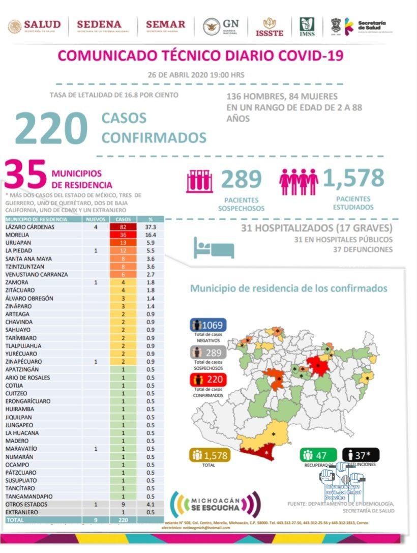 MORELIA, MICH., 26 DE ABRIL DE 2020. – De acuerdo al Comunicado Técnico diario COVID-19, del Comité de Seguridad en Salud, al 26 de abril de 2020, se registran ya 220 casos de COVID-19 en 35 municipios y 37 defunciones por esta causa en el estado de Michoacán, lo que evidencia que el coronavirus tiene un acelerado avance dentro del territorio michoacano.