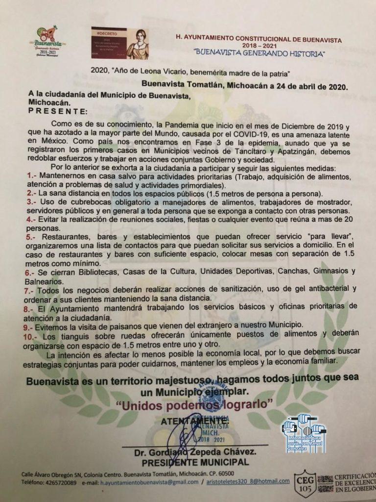 BUENAVISTA, MICH., 26 DE ABRIL DE 2020.- Ante la amenaza del COVID-19 y al encontrarnos en Fase 3 de la pandemia en nuestro País, debemos extremar precauciones para que el municipio de Buenavista continúe con cero casos afirmo el Alcalde Dr. Gordiano Zepeda Chávez, quien también dio a conocer una serie de medidas preventivas para evitar que el coronavirus afecte a la población Buenavistense.