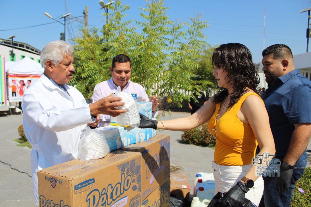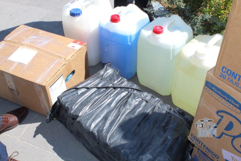 El paquete de materiales donados por el Legislador y la Regidora que fueron recibidos por el director del nosocomio Víctor Esparza Yáñez y el Administrador Antonio Cabrera incluyo, 100 caretas de protección facial, 60 cubrebocas N-95, 900 piezas de toalla interdoblada, 20 litros germilin, 20 litros sanitizante, un bulto de 25 kg de bolsa para basura, 100 litros de cloro, 20 litros de shampoo anti bacterial para manos, y 5 cajas de guantes estériles.