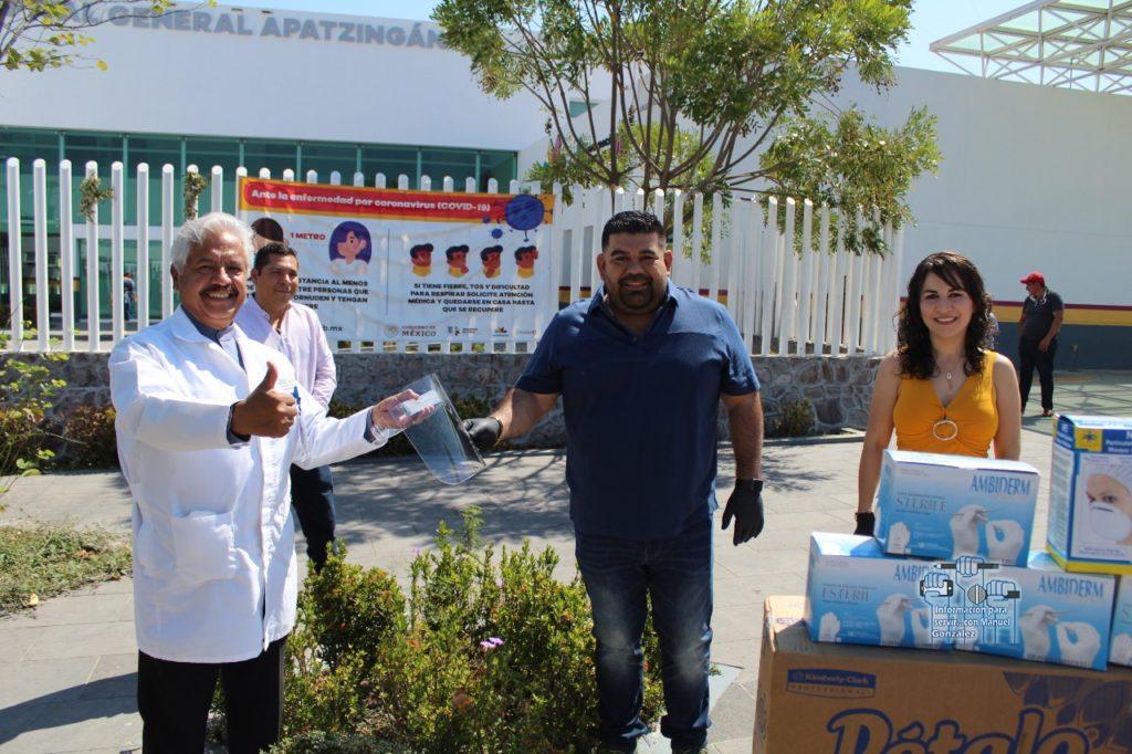APATZINGAN, MICH., 15 DE ABRIL DE 2020. – El Diputado Federal Paco Huacus Esquivel y la Regidora del PT Blanca Azucena Álvarez Chávez hicieron una importante donación de productos de limpieza y protección al Hospital Regional de Apatzingán, dentro del que se incluye material como caretas para médicos enfermeras y cubrebocas certificados para protección del personal de salud que esta en la primera línea del combate al COVID-19.