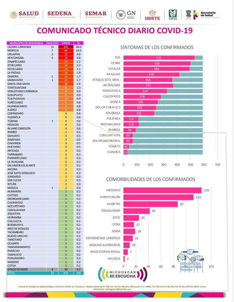 MORELIA, MICH., 11 DE MAYO DE 2020. – De acuerdo al Comunicado Técnico diario COVID-19, del Comité de Seguridad en Salud, a la fecha en la entidad se registran 632 casos de COVID-19, de los cuales 24 corresponden a Apatzingán pues este lunes se reportaron 5 casos nuevos, 2 a la Huacana, 2 a Múgica pues se reporto uno más y 1 a Buenavista, con el que suman 29 el número de casos acumulados en las demarcaciones de la JS07 que abarca 9 municipios.