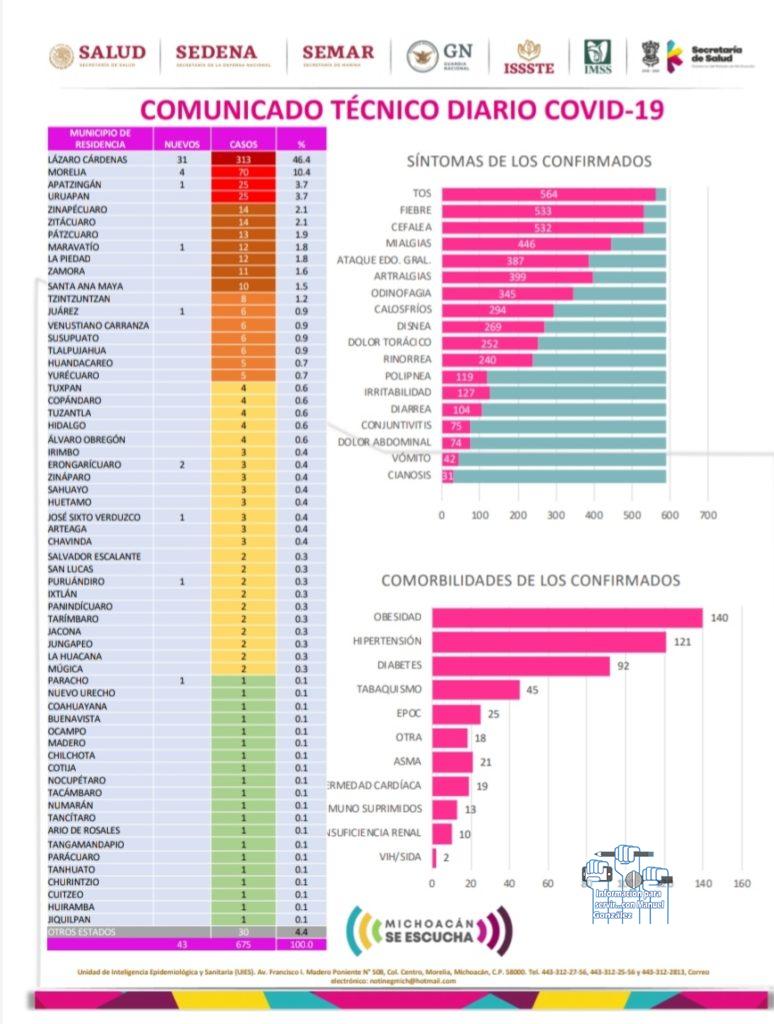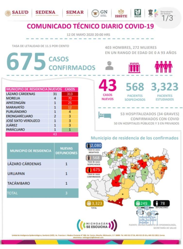 MORELIA, MICH., 12 DE MAYO DE 2020. – De acuerdo al Comunicado Técnico diario COVID-19, del Comité de Seguridad en Salud, a la fecha en la entidad se registran 675 casos de COVID-19, de los cuales 25 corresponden a Apatzingán pues este mastes se reporto un caso nuevo con lo que se coloca como el tercer municipio del estado con más casos.