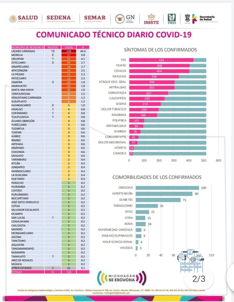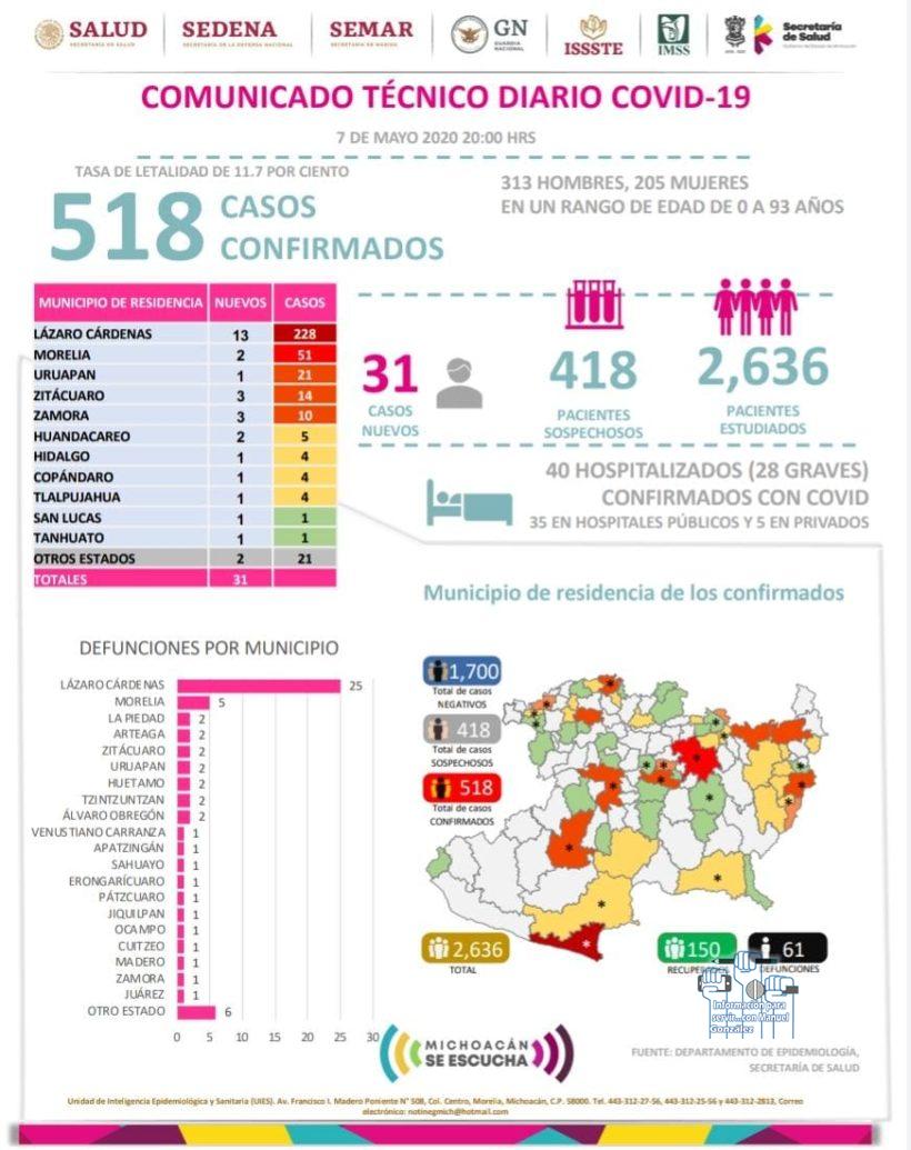 MORELIA, MICH., 07 DE MAYO DE 2020. – De acuerdo al Comunicado Técnico diario COVID-19, del Comité de Seguridad en Salud, a la fecha en la entidad se registran ya 518 casos de COVID-19 de los cuales 13 corresponden al municipio de Apatzingán en tanto que en Huacana ya son 2 y 1 de Múgica, por lo que en la JS07, suman 16 casos de coronavirus.