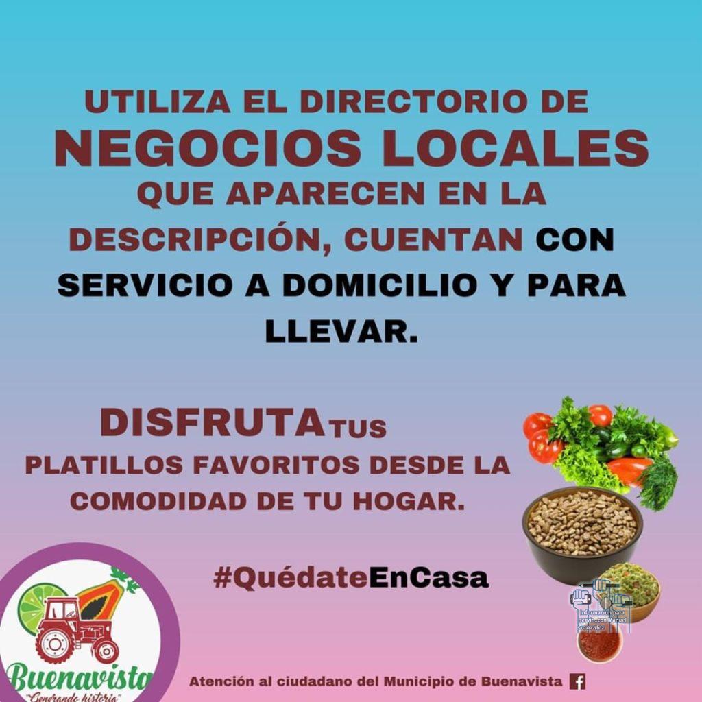 El Gobierno Municipal de Buenavista que preside el Dr. Gordiano Zepeda Chávez, continúa fortaleciendo las estrategias para la prevención del COVID-19 y de este modo contribuir a que el municipio siga con cero casos de la enfermedad, parte de ello es las continuas evaluaciones en el comportamiento de la enfermedad, así como estrategia impulsada para que a través de la página de Facebook del Ayuntamiento se publicaran directorio de establecimientos comerciales a través de los cuales lo alimentos se soliciten sin tener que salir de casa, con lo que se está apoyando tanto al sector comercio como a la población para que puedan quedarse en sus hogares, medida que reconocen autoridades de salud como una acertada decisión de parte de la autoridad municipal.
