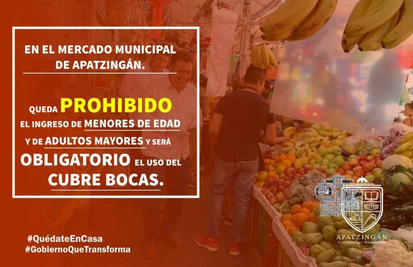 APATZINGÁN, MICH., A 09 DE MAYO DE 2020.- Por tratarse de un espacio que registra una importante afluencia de personas diariamente, a partir de este sábado y hasta que concluya esta emergencia sanitaria, en el mercado municipal Ignacio López Rayón, ha quedado prohibido el acceso de adultos mayores, niños y quien acuda a este lugar a surtir su despensa deberá utilizar cubrebocas de manera obligatoria.