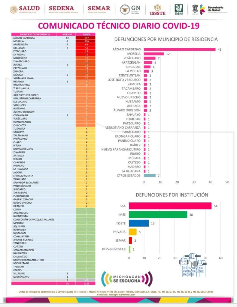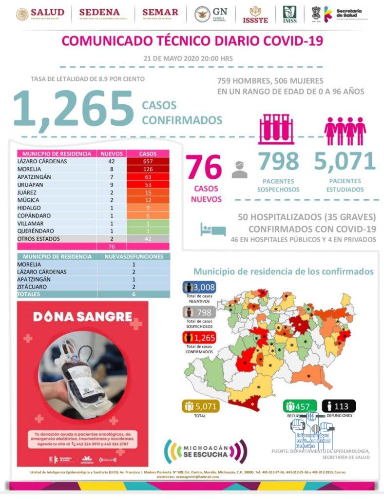 A nivel estatal las cifras reportadas son mil 265 casos, 113 defunciones y 457 pacientes recuperados y de acuerdo a este informe técnico Lázaro Cárdenas, Morelia y Apatzingán, registran el mayor número de contagios del COVID-19 hasta esta fecha.