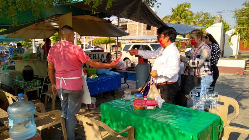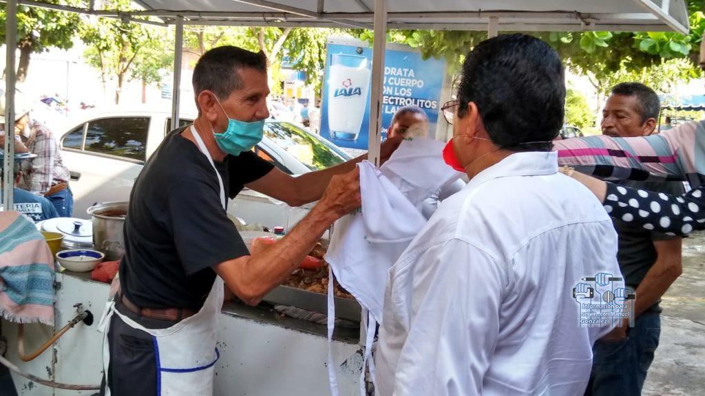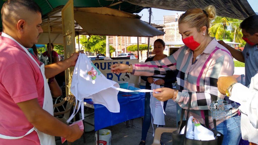 - Este martes se distribuyeron mandiles, cubrebocas y se invitó a los comerciantes a guardar una sana distancia, lavado frecuente de manos y a que atiendan las recomendaciones sanitarias: Dr. Gordiano Zepeda Chávez.