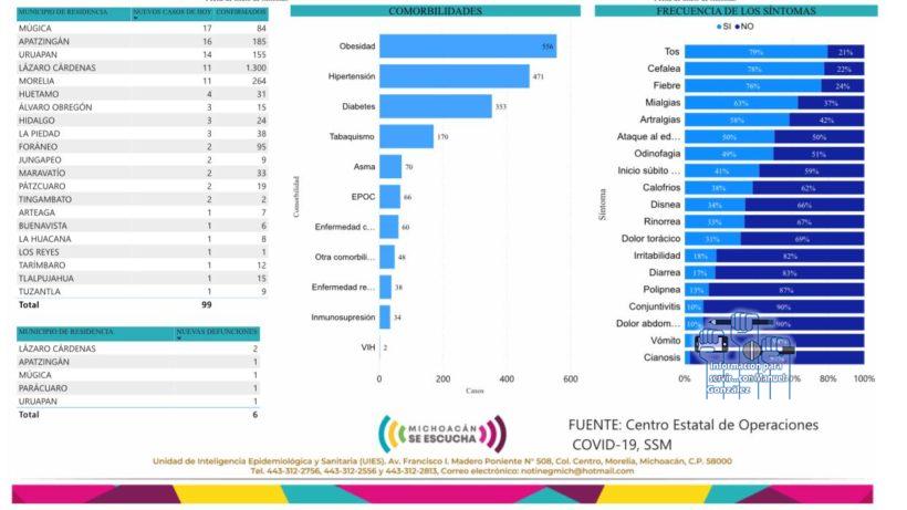 Múgica también recibió esta noche el reporte de 17 nuevos casos, por lo que la cifra de positivos se eleva a 84 y con la defunción registrada este lunes ya suman 13 las víctimas mortales por COVID-19 en esta municipalidad, en Parácuaro esta noche se reportó una nueva defunción y un caso nuevo en Huacana y uno más en Buenavista.