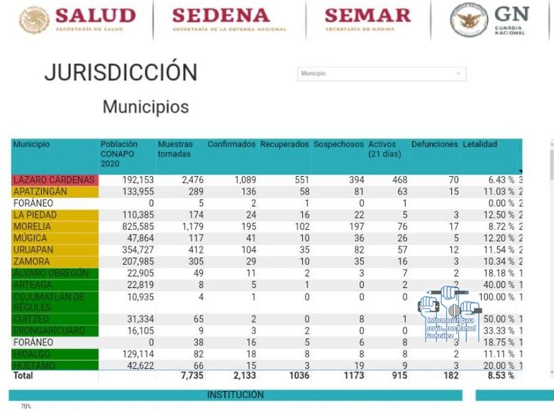 Con los nuevos casos reportados en municipios de esta región, ahora la Jurisdicción Sanitaria 07, registra un acumulado de 197 casos, de los cuales 136 corresponden a Apatzingán de los cuales 63 son activos con síntomas registrados los últimos 21 días en Múgica se tienen registrados 41 de los cuales 26 se encuentran activos, en tanto que Parácuaro acumula 8, La Huacana 4, Buenavista 3, Coalcomán 2 y Churumuco 1.
