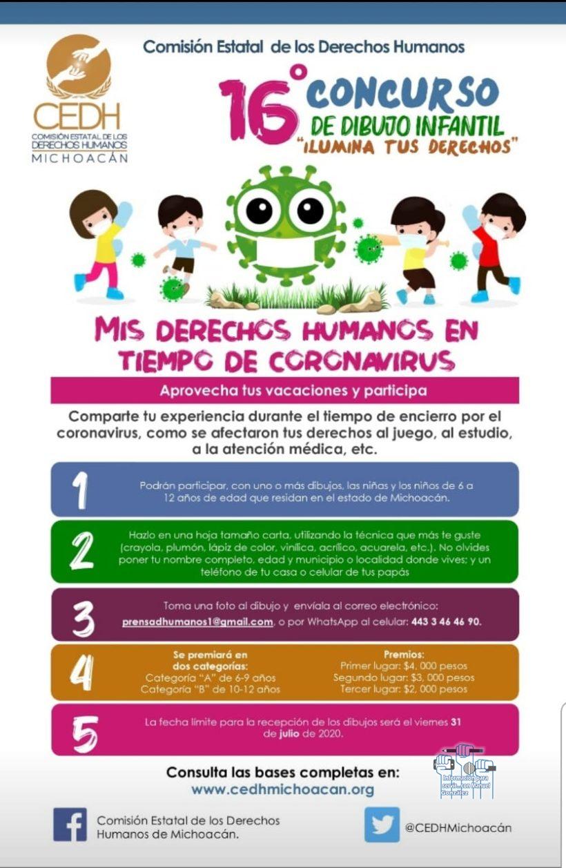 Apatzingán, Mich., a 09 de julio de 2020.- La Comisión Estatal de los Derechos Humanos (CEDH), relanzó la convocatoria para el Concurso Infantil de Dibujo “Ilumina Tus Derechos” en su décimo sexta edición, el cual lleva por título “Mis derechos en tiempo de Coronavirus”.