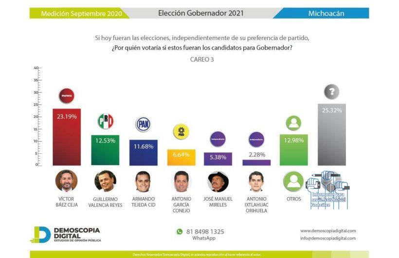 MORELIA, MICH., 07 DE SEPTIEMBRE DE 2020.- De acuerdo al resultado de la última encuesta, si hoy fueran las elecciones en Michoacán, indiscutiblemente el ganador de la contienda para Gobernador, seria Víctor Báez Ceja, pues en base a dicho conteo realizado por Demoscopia Digital, el ahora alcalde de Pátzcuaro tiene el 23.19 por ciento de las preferencias en la intención del voto de los michoacanos.