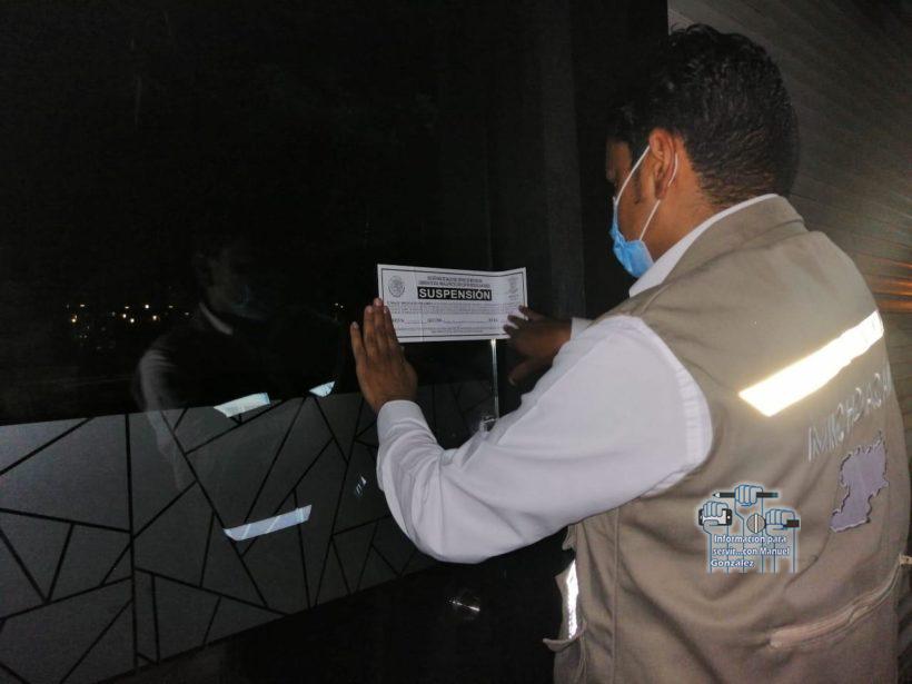 El día de ayer, 15 de septiembre, a través de la Comisión Estatal de Protección contra Riesgos Sanitarios (COEPRIS), se suspendieron nueve establecimientos que no cumplían con las medidas sanitarias, cinco en Apatzingán, dos en Múgica y dos más durante operativo nocturno en Morelia.