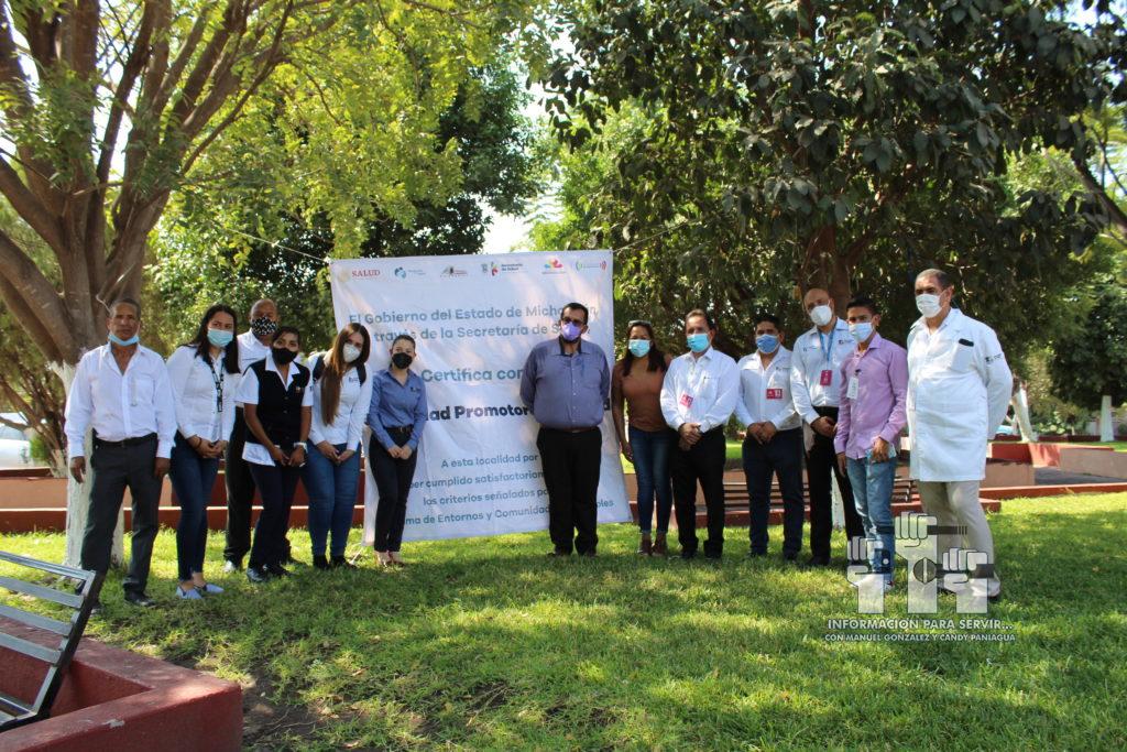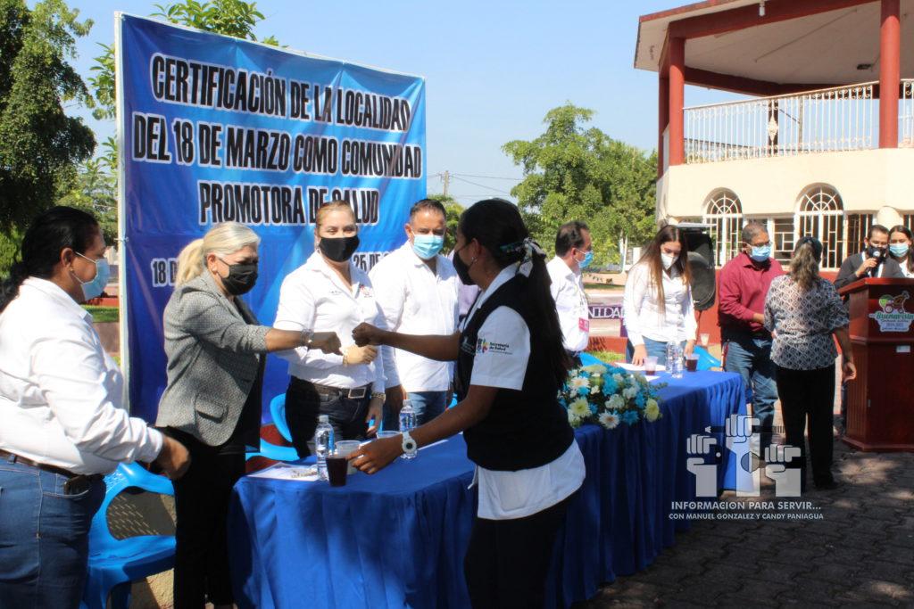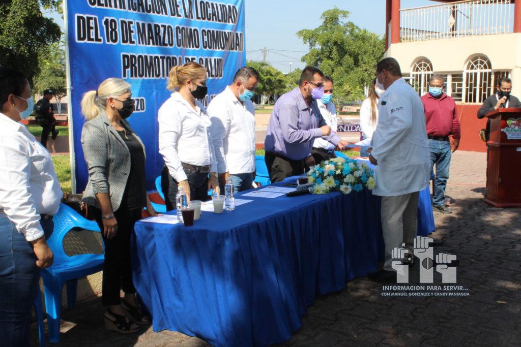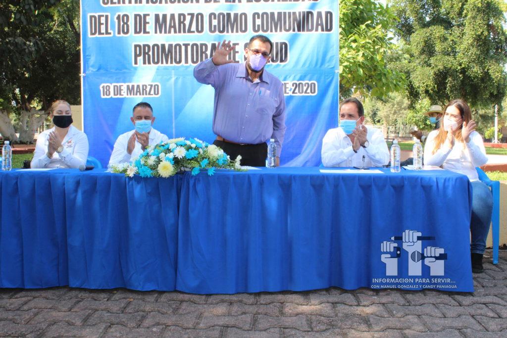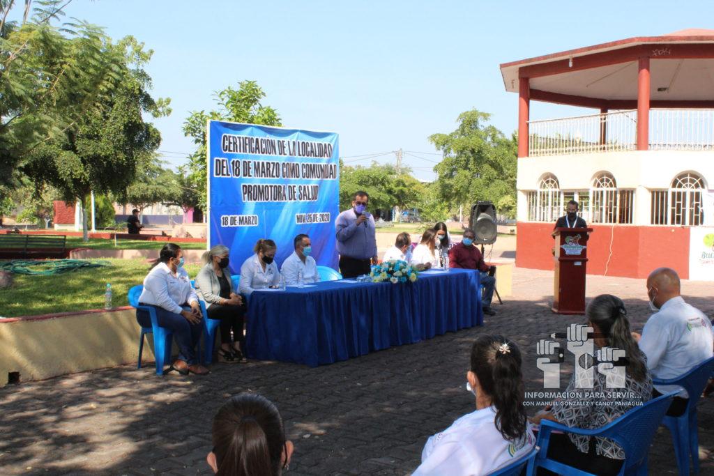 18 DE MARZO, MPIO. DE BUENAVISTA, MICH., 26 DE NOVIEMBRE DE 2020.- Al presidir la ceremonia con motivo de la certificación de la comunidad del “18 de Marzo”, como una comunidad Promotora de Salud, el Presidente Municipal de Buenavista, Dr. Gordiano Zepeda Chávez dijo, que, al coincidir y sumar esfuerzos con autoridades de salud de la JS07 y la localidad, se obtiene este reconocimiento y hoy “18 de Marzo” debe tomarse como ejemplo para que en el futuro próximo se pueda trabajar de la mano, el Ayuntamiento, la SSM, la JS07, el IMSS Bienestar a fin de lograr la certificación de todo el municipio como “Promotor de la Salud”.