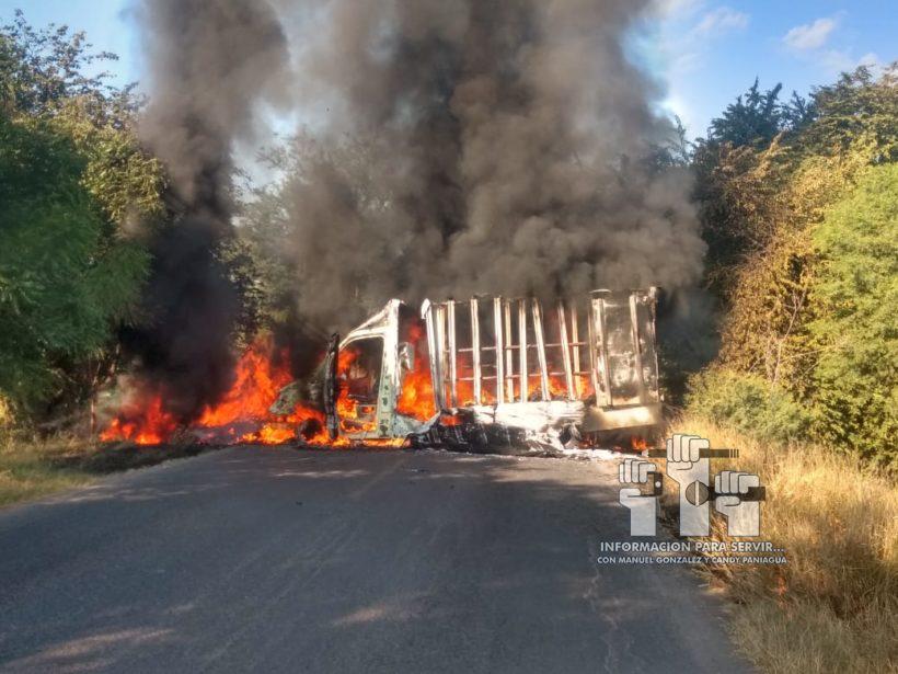 APATZINGÁN, MICH., 15 DE DICIEMBRE DE 2020. – Bloqueo Carretera Apatzingán – Aguililla ala altura de la Loc. La Concha perteneciente a este Municipio de Apatzingán Michoacán, dónde se visualizan una camioneta de la marca Ford150 y un camión de la empresa Bimbo incendiado el cual bloquea dicha carretera vial.