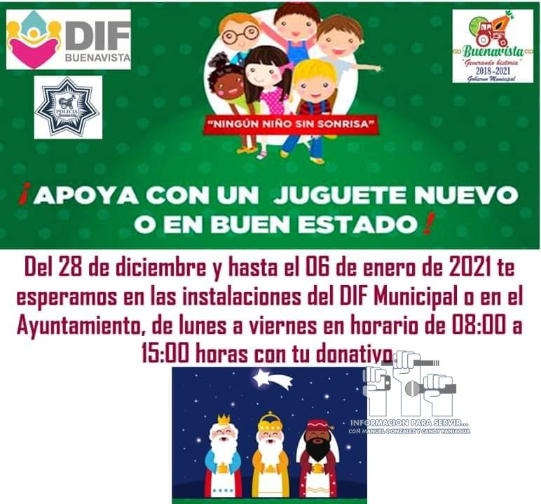 BUENAVISTA, MICH., 30 DE DICIEMBRE DE 2020. – Bajo el lema «No hay sonrisa más noble que la de un niño feliz», el Gobierno Municipal de Buenavista que encabeza el Dr. Gordiano Zepeda Chávez y el Comité Municipal del DIF que preside la Dra. Melina Zepeda Chávez, llevan a cabo una colecta de juguetes que distribuirán el 6 de enero, en el marco del Día de Reyes.