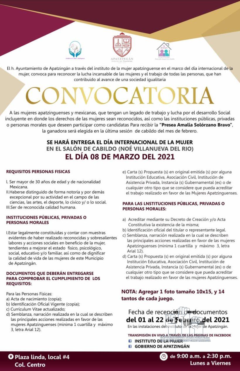 Apatrzingán, Mich., a 17 de Febrero de 2021.- El gobierno municipal, a través del Instituto Municipal del Mujer Apatzinguense (IMMA), amplío la convocatoria para la entrega de la Presea “Amalia Solórzano Bravo”, que se llevará a cabo el 8 de marzo próximo, con motivo del Día Internacional de la Mujer.