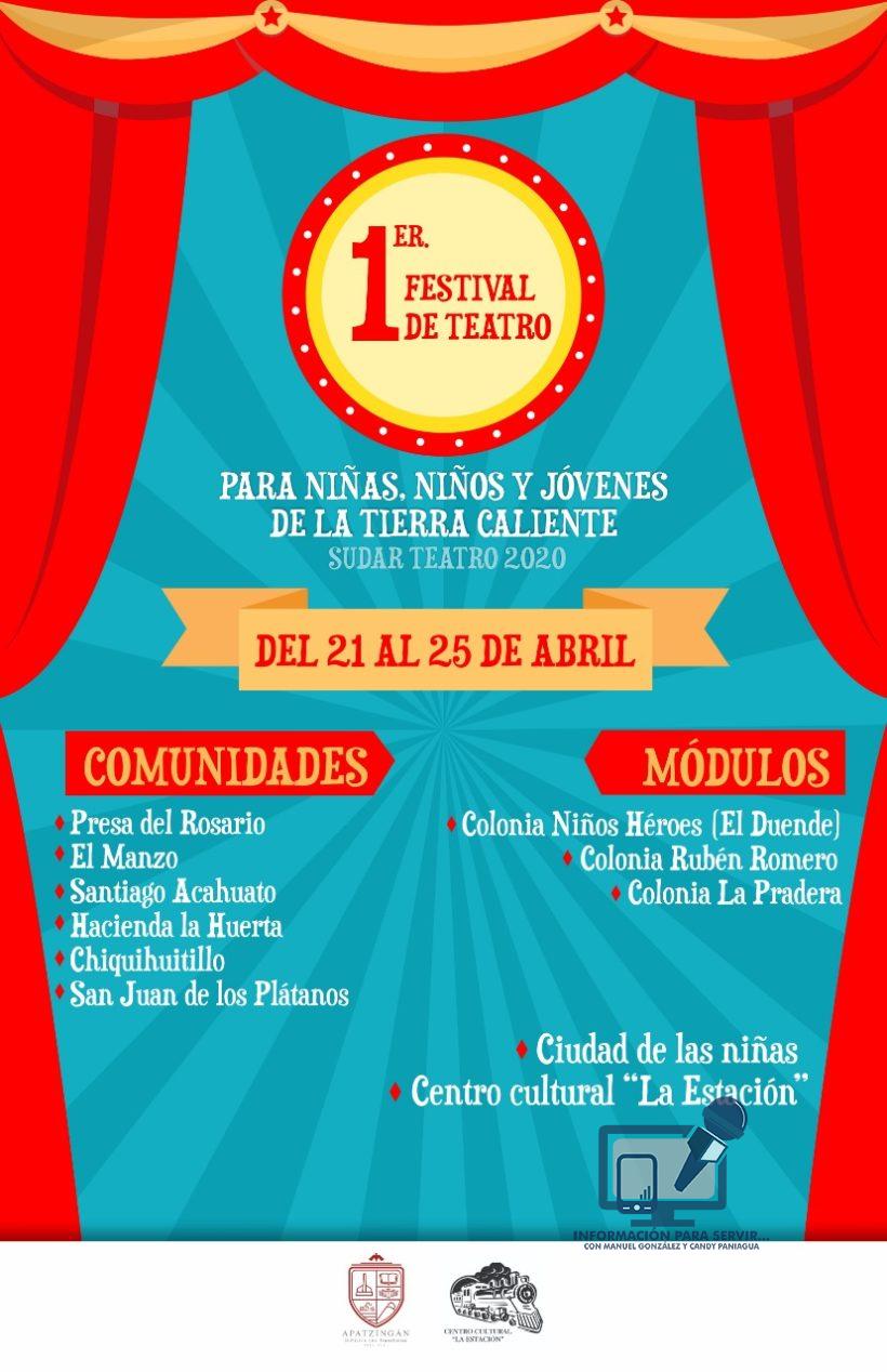 Apatzingán, Mich., a 13 de abril de 2021.- Con la finalidad de acercar la cultura a las comunidades rurales, a través del Centro Cultural “La Estación”, se realizará el Primer festival de teatro para niñas, niños y jóvenes de la Tierra Caliente SUDAR TEATRO 2020.