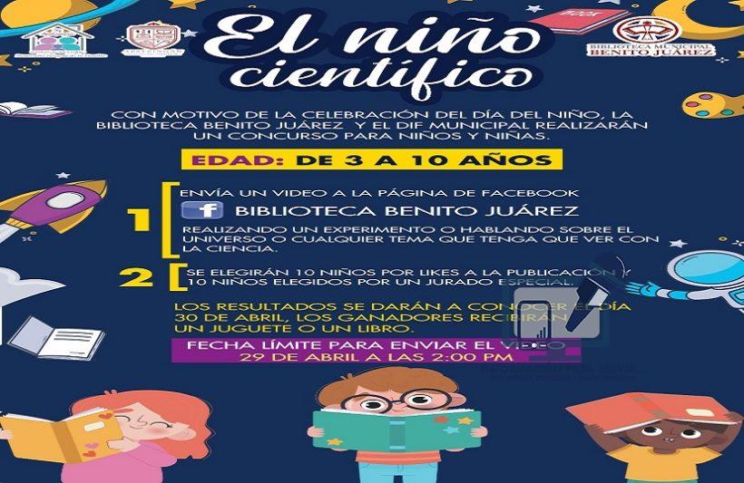 Apatzingán, Mich., a 20 de abril de 2021.- Con motivo de la celebración del Día del Niño, la biblioteca pública “Benito Juárez” y el DIF Municipal, lanzaron la convocatoria para el concurso “El Niño Científico”, dirigido a menores de entre 3 y 10 años de edad.