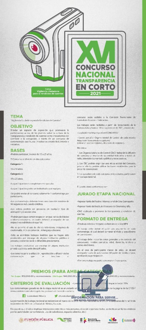 Apatzingán, Mich., a 04 de mayo de 2021.- Con el objetivo de brindar un espacio de expresión que promueva la participación activa de los jóvenes sobre la cultura de la transparencia y rendición de cuentas como mecanismos de combate a la corrupción, la Comisión Permanente Estados-Federación en el Marco del Programa Anual de Trabajo 2021, convoca al Concurso Nacional de “Transparencia en Corto”, bajo la temática “Vigilancia Ciudadana para la Rendición de Cuentas”.