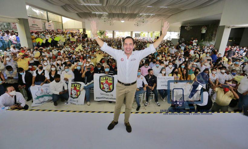 El candidato a la gubernatura del PRI, PAN y PRD planteó terminar con el principal pendiente de los trabajadores de la salud: las disparidades con las prestaciones de los trabajadores, a trabajo igual, salario y prestaciones iguales, es un derecho.