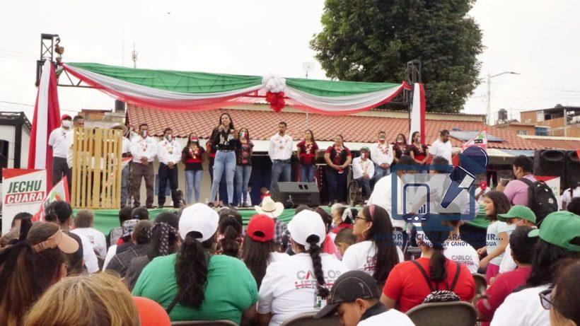 Nuevo Parangaricutiro, Michoacán.- Con gran entusiasmo cerraron campaña en esta cabecera municipal los candidatos del Partido Revolucionario Institucional (PRI) tanto al Ayuntamiento, Jesús Cuara, como a la diputación local 23, Fanny Arreola Pichardo.