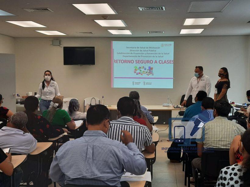 La funcionaria estatal de salud detallo, que durante la capacitación que tuvo lugar en el aula del Hospital Regional de Apatzingán, el grupo multidisciplinario de Promoción de la Salud integrado además por el C. D. Ulises Pérez Gracian, los Licenciados en Salud Pública Yuridia García Espíndola, Montserrat Castillo Mendoza, Mario Germán Chávez y el nutriólogo Fernando Valencia Hernández, presentaron el protocolo para prevenir contagios, panorama epidemiologico del Covid-19, filtros escolares que incluyen revisión de temperatura, uso obligatorio del cubrebocas y aplicación del gel antibacterial.