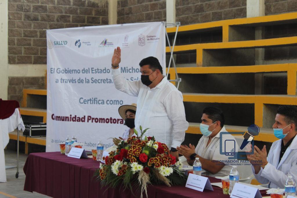 CEÑIDOR, MPIO., DE MUGICA., 17 DE NOVIEMBRE DE 2021.- En el marco de la celebración del evento de certificación como Comunidad Promotora de Salud de la Localidad del Ceñidor, perteneciente al municipio de Múgica, el Presidente Municipal Hugo Wulfrano Andrade López, reconoció el importante beneficio que programas como el de Comunidades y Entornos Saludables representan para la comunidad, a la cual exhorto a seguir trabajando para construir desde el hogar comunidades y entornos limpios y sanos.