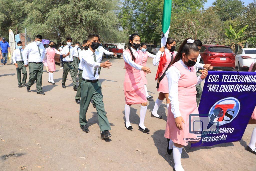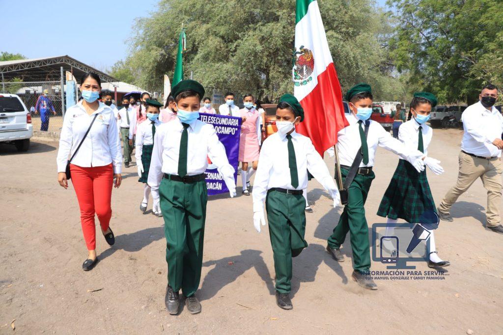 APATZINGAN, MICH., 24 DE FEBRERO DE 2021.- Con un acto cívico y desfile encabezado por el presidente municipal, José Luis Cruz Lucatero y, la encargada del orden, Norma Ramírez, celebran el LX Aniversario de la fundación del Ejido » Mirador».