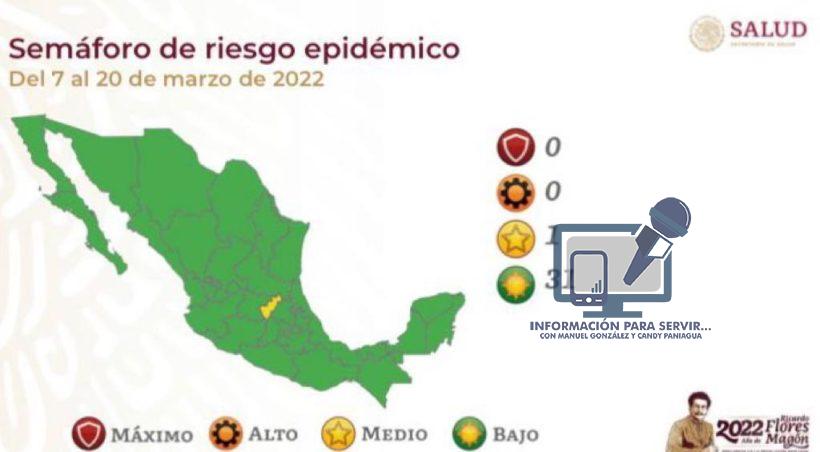 Morelia, Michoacán, 4 de marzo del 2022.- El Semáforo de Riesgo Epidemiológico del 7 al 20 de marzo del 2022, colocará nuevamente al Estado de Michoacán en color verde, debido a la baja importante de casos de COVID-19, al igual que 31 entidades, solamente excluyendo a Querétaro que permanece en amarillo.