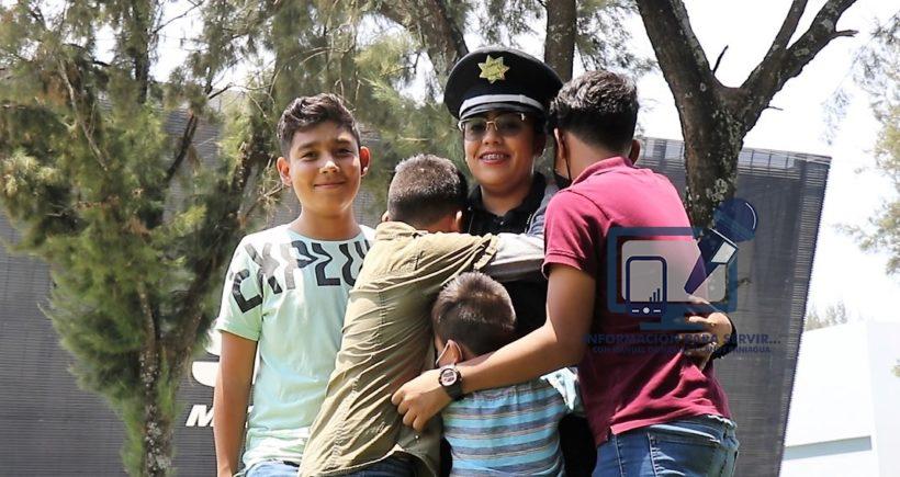 Morelia, Michoacán, 10 de mayo del 2022.- Dulce Angélica, es una joven mujer y madre policía, quien forma parte del personal del recientemente creado Agrupamiento de la Policía Turística, de la Secretaría de Seguridad Pública (SSP). Con cuatro hijos -uno en secundaría y tres más en primaria-, Angélica vive su día a día con la energía que le transmiten sus pequeños al demostrar su apoyo incondicional por su labor, misma que realiza diariamente entusiasmada.